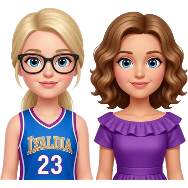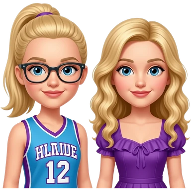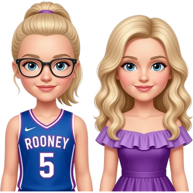 (2 dove camerons with blonde hair, one's hair straight and in a ponytail, she has glasses and is wearing a blue and purple basketball jersey with "Rooney" and 5 on it. the other one's hair is blonde, long and curled and she is wearing a dress with a purple ruffle. she looks like an actress emoji