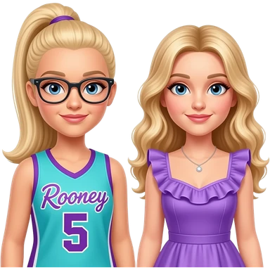 (2 dove camerons with blonde hair, one's hair straight and in a ponytail, she has glasses and is wearing an aqua and purple basketball jersey with "Rooney" and 5 on it. the other one's hair is blonde, long and curled and she is wearing a dress with a purple ruffle. she looks like an actress emoji