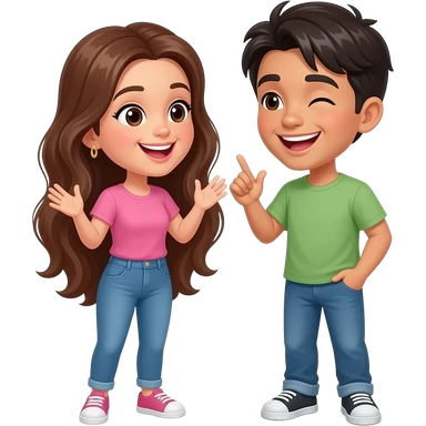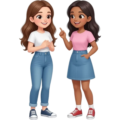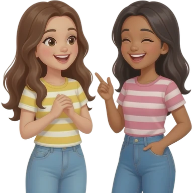 A white skin, very long haired brunette and a white skin dark haired best friends, girls, full body, chatting, laughing emoji