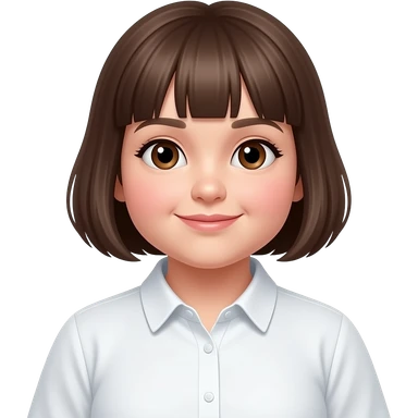 Una niña piel blanquita rellenita con fleco cabello corto y color castaño ojos color cafes con camisa blanca de botones emoji