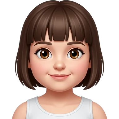 Una niña piel blanquita rellenita con fleco cabello corto y color castaño ojos color cafes emoji