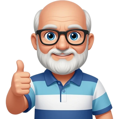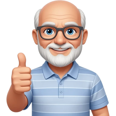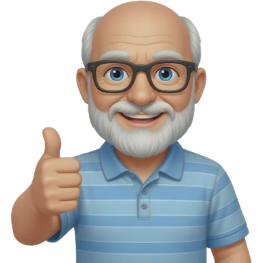 old bald man with white beard, blue eyes, black glasses, thumbs up, polo shirt emoji