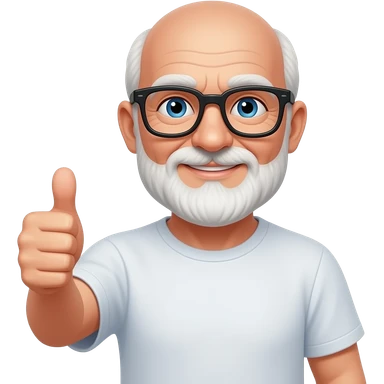 old bald man with white beard, blue eyes, black glasses, thumbs up, t shirt emoji