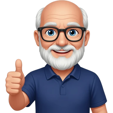 old bald smiling man with white beard, blue eyes, black glasses, thumbs up, navy blue polo shirt emoji