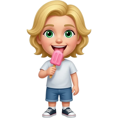 Lizanie loda na patyku w kolorze różowym językiem włosy blond zielone oczy emoji