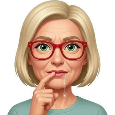 Ssanie palca przez starszą kobietę i szczuplejszej twarzy językiem włosy blond zielone oczy i okulary w kolorze czerwonym, kapiąca ślina, opryszczka na dolnej wardze emoji
