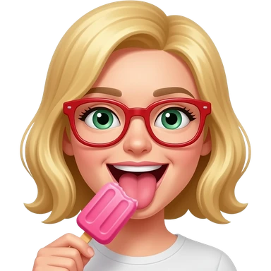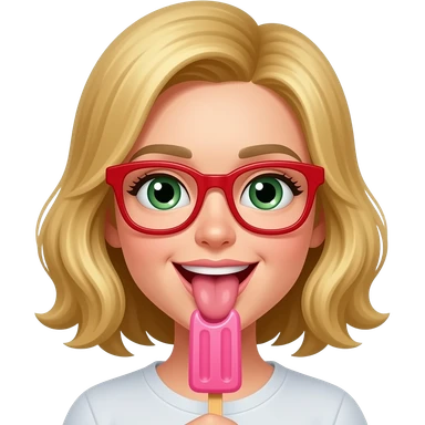 Gryzienie loda na patyku w kolorze różowym językiem włosy blond zielone oczy i okulary w kolorze czerwonym emoji