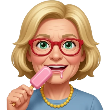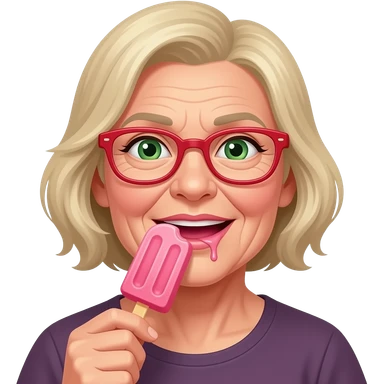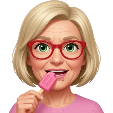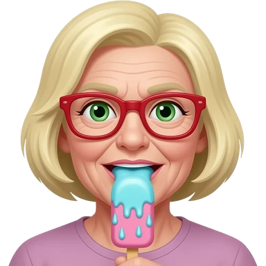 Gryzienie loda przez starszą kobietę na patyku w kolorze różowym językiem włosy blond zielone oczy i okulary w kolorze czerwonym, kapiąca ślina emoji