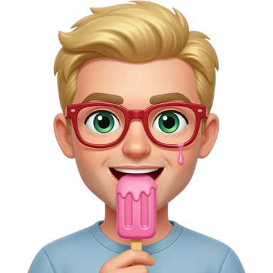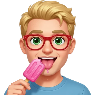Gryzienie loda na patyku w kolorze różowym językiem włosy blond zielone oczy i okulary w kolorze czerwonym, kapiąca ślina emoji