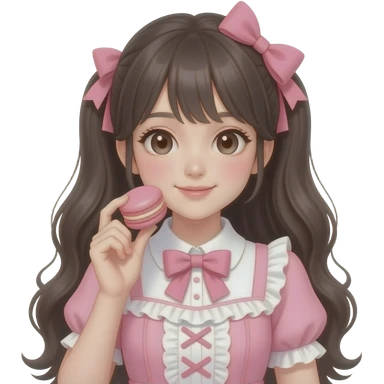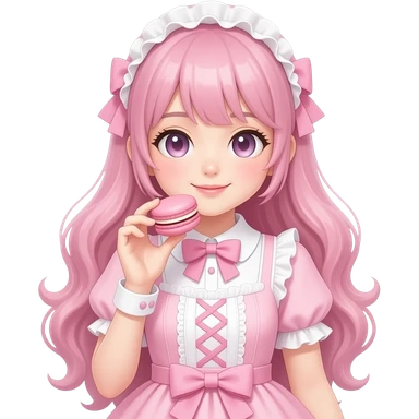 a light pink lolita hime gyaru dress with a macaron in hand, emoji style emoji