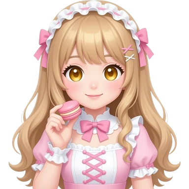 a light pink lolita hime gyaru dress with a macaron in hand, ios emoji styl soft big eyes golden eyes e emoji