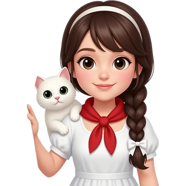 girl with long dark brown braid and bow, red scarf, white dress, holding white cat on shoulder, peekioong from behind , smooth glossy texture, soft lighting, kawaii style emoji emoji