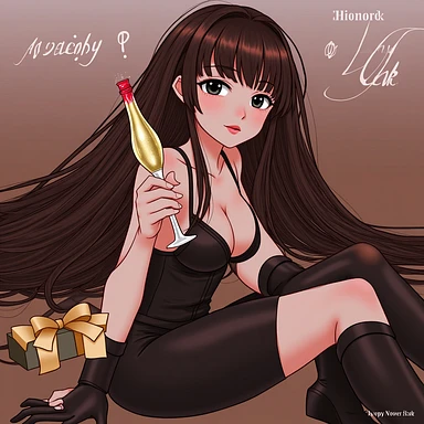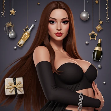 Art of nude woman's very sexy body scheme anatomy-bare shoulders and black eyes-very long straight brunette hair spreading legs and showing her pussy in seductive pose. New year elements: champagne, gift emoji