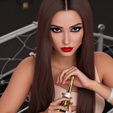 Art of nude woman's very sexy body scheme anatomy-bare shoulders and black eyes-very long straight brunette hair spreading legs and showing her pussy in seductive pose. New year elements: champagne, gift 2026 year emoji