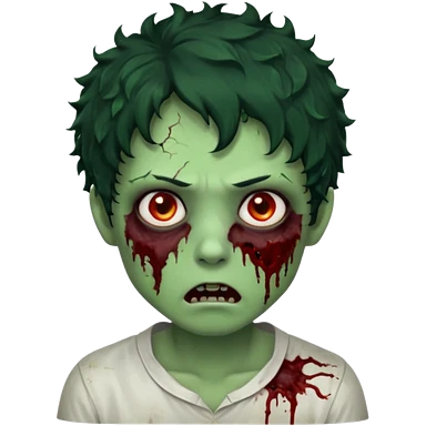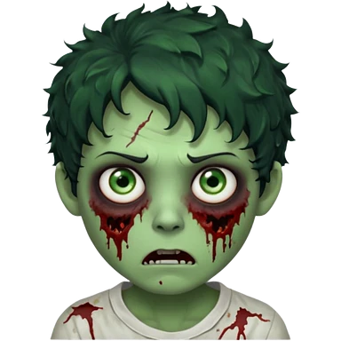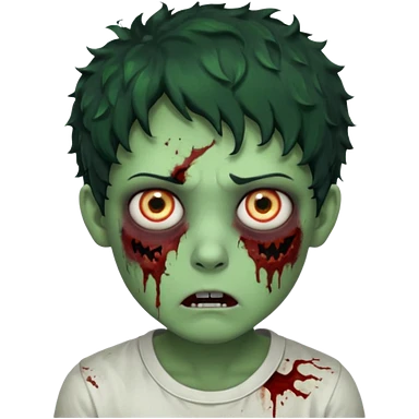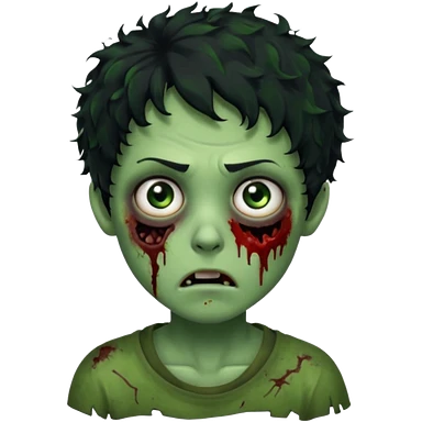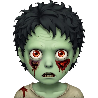 zombie character with green skin, messy short curly black hair, and no glasses. Give him large expressive eyes, a slightly frightened or eerie expression, subtle wounds, dark under-eye shadows, and a few cracks or dried blood marks on the face. emoji