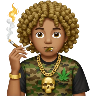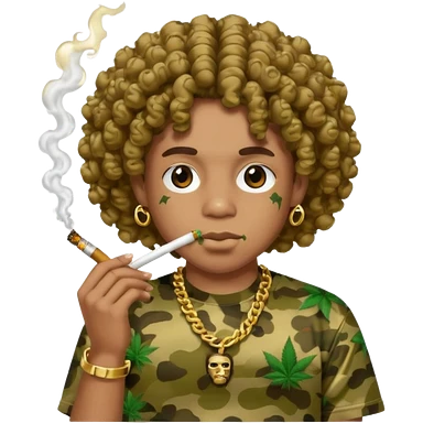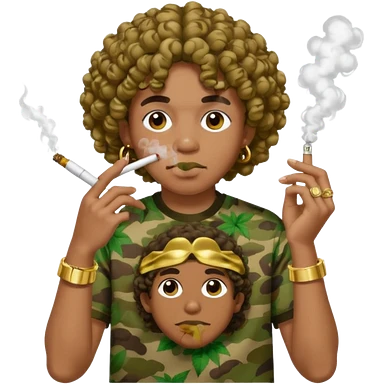 curly hair wearing bathing ape shirt smoking weed with grills emoji