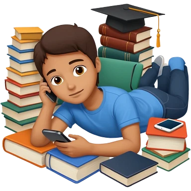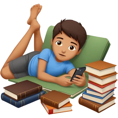 emoji student lying with phone instead of studying, lazy, books, white background, emoji