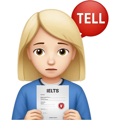 студентка грустная после провального экзамена IELTS смотрит свои результаты на сертификате с текстом IELTS на белом фоне emoji
