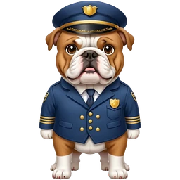 English bulldog dressed as a tour guide, icon style, with a whistle and a badge emoji