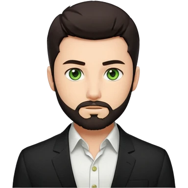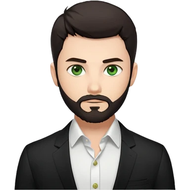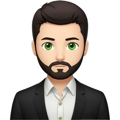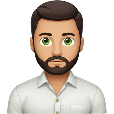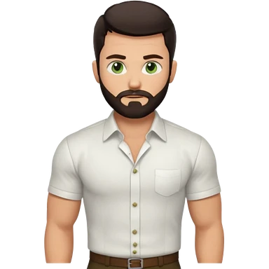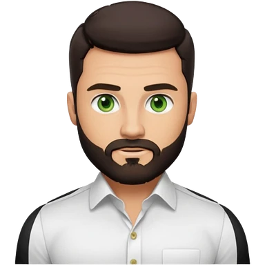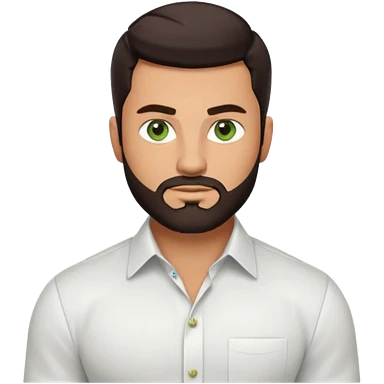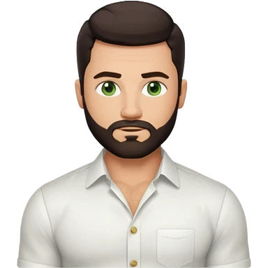 Man with a short full beard, Styled hair, Best looking man in the planet, onepiece style dark hair, green eyes, more realistic style more maskulin. Wearing a white formal shirt, first buttons open macho style, muscular emoji