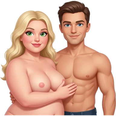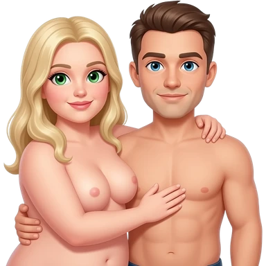 A heavy set naked white woman with blond hair and green eyes holding a naked white male with brown hair and blue eyes n emoji