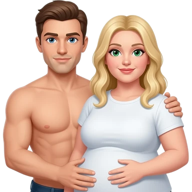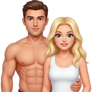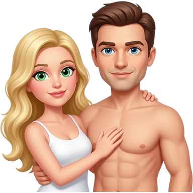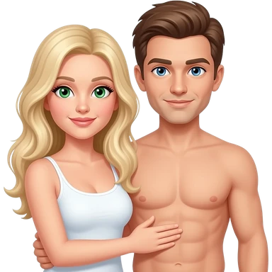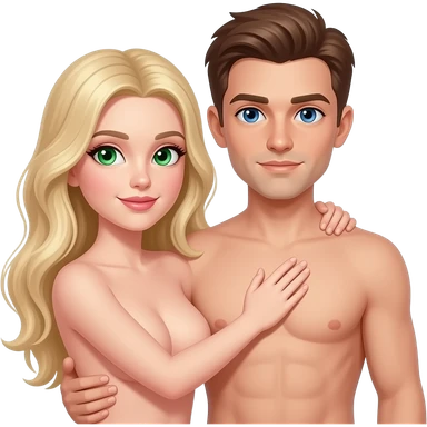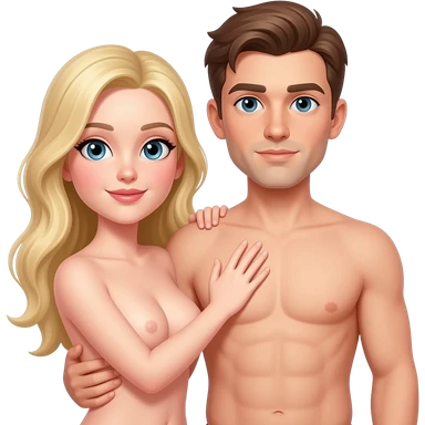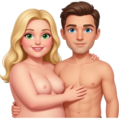 A naked white woman with blonde hair and green eyes holding a naked white male with brown hair and blue eyes without 6 pack abs emoji