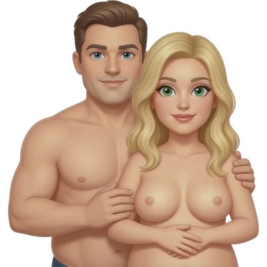 A naked white woman with blond hair and green eyes holding a naked white male with brown hair and blue eyes showing chest up emoji