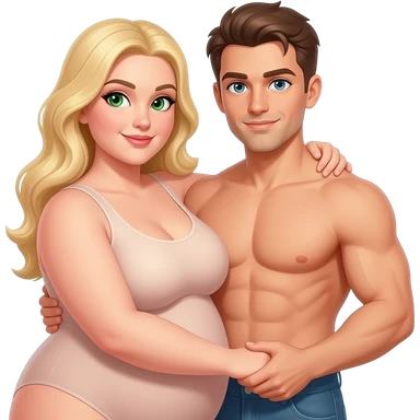 A heavy set naked white woman with blond hair and green eyes holding a naked white male with brown hair and blue eyes no mucles emoji