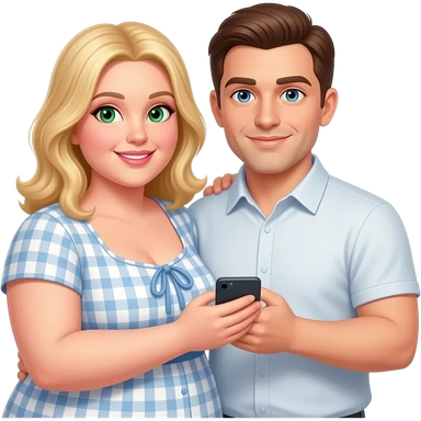 A heavy set naked white woman with blond hair and green eyes holding a naked white male with brown hair and blue eyes and heavy set emoji