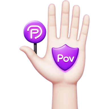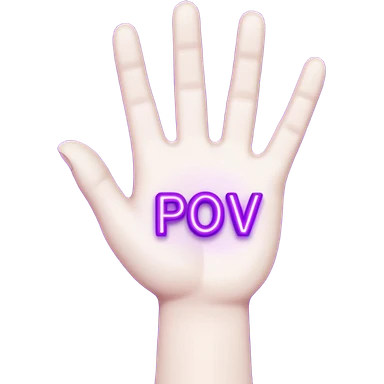A 3D stylized cartoon hand holding a glowing neon purple sign that says "POV", high contrast, vibrant lighting, clean edges, white background. emoji