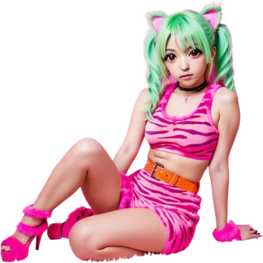 Heavily tan, Long waist length pastel green hair in messy and spikey pigtails with light pink streaks, Narrow dark brown eyes, Heavy and dramatic Gyaru makeup, Orange short and tight tiger print tank dress with a hot pink bra peeping out, Fuzzy faux fur leg warmers, Hot pink heels, Hot pink belt, Light pink and brown alba rose coat, Light pink scarf, Long and sharp pastel green nails with pink and blue charms on it, Angel bite piercings, Eyebrow piercing emoji
