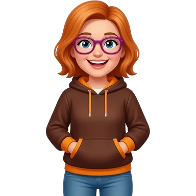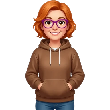 una señora de 38 años con sudadera marron amarangado com pelo amaranjado y pantalones casuales y que se vea joben y que tenga lentes fuccia oscuro emoji