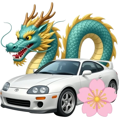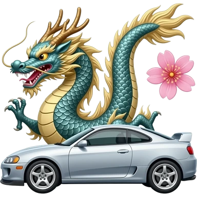 un carro toyota celica cuarta generacion con un dragon grande al lado de sticker en el auto con flores de sakura emoji