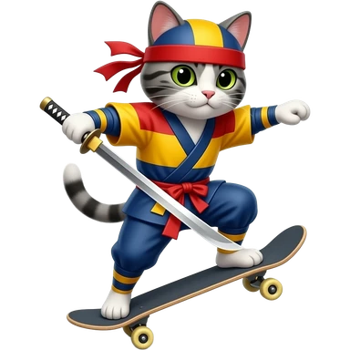 hazme un gato que este con en skate partinando con un oufit de un Ninja con lo colores de españa con una katana emoji