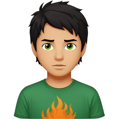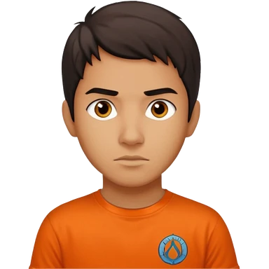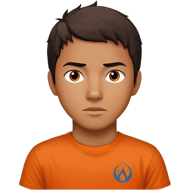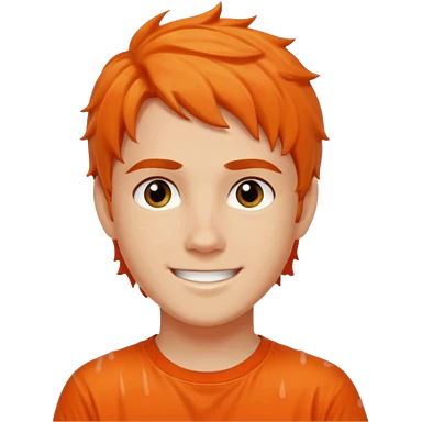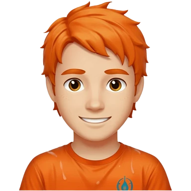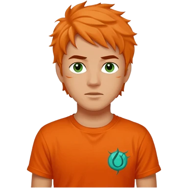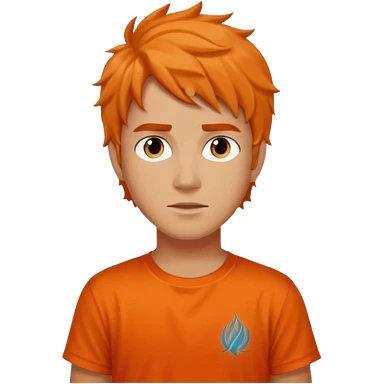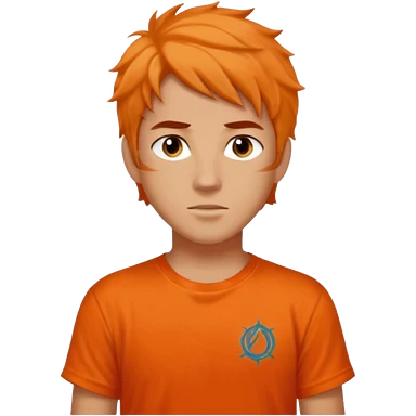 teenage boy with curly blond hair and blue eyes with freckles wearing an orange “Camp Halfblood” tshirt with the official percy jackson camp halfblood logo on it have hime doing a shocked face emoji