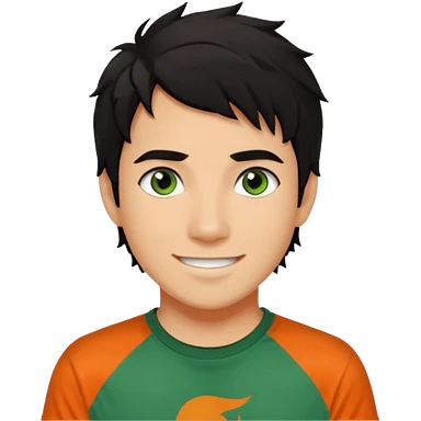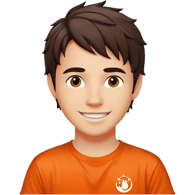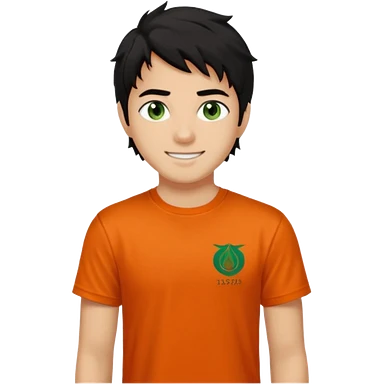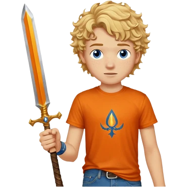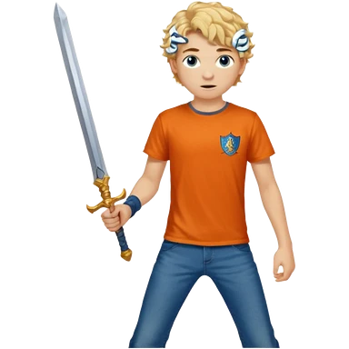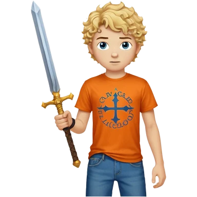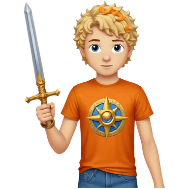 20 year old boy with curly blond hair and blue eyes with freckles wearing an orange no blue “Camp Halfblood” tshirt with the official percy jackson camp halfblood logo on it and blue jeans have him swinging a gold sword emoji