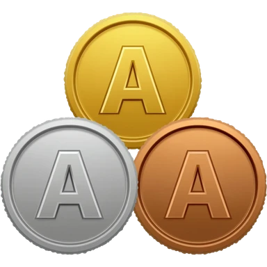 A bunch of 3 coins with an A on the center of the 3 coins, 1 of them are golden, 1 of them are silver & 1 of them are of bronze emoji