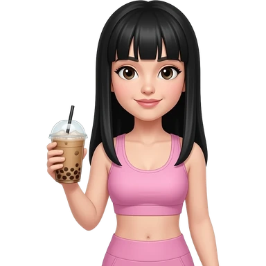 Long straight black hair, bangs, white skin, ice coffe in hand, light pink workout clothes emoji