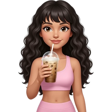 Long curly black hair, bangs, white skin, ice coffe in hand, light pink workout clothes emoji