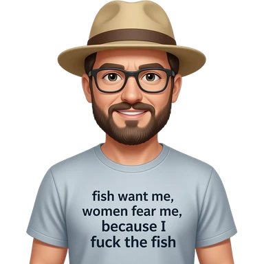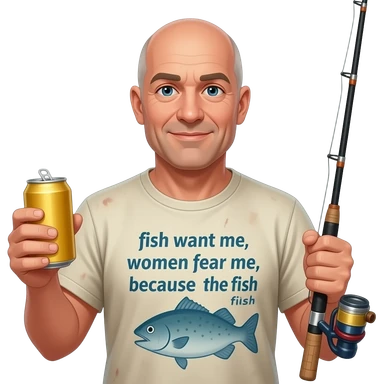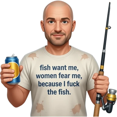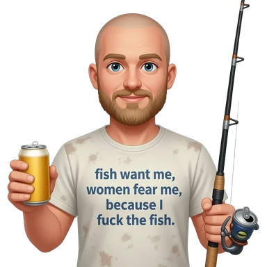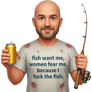 A 30 year old fisherman wearing a well-worn in t shirt that says “fish want me, women fear me, because I fuck the fish.” He has a beer can in one hand and a fishing rod in the other hand. Make him bald emoji