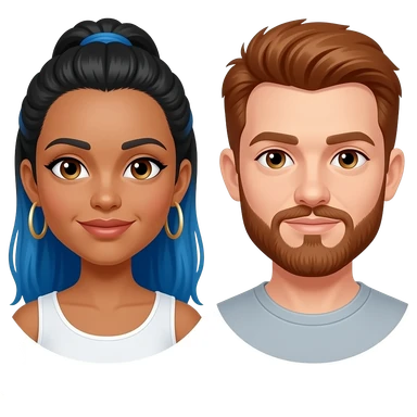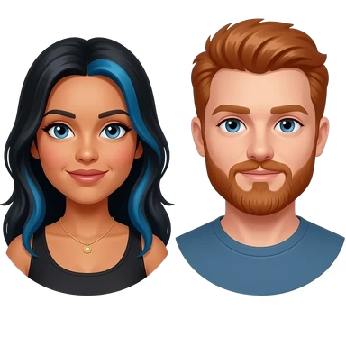 latin woman with blue streaks in hair and red hair man grey beard emoji