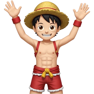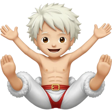 a joyful cartoon-style emoji of Luffy as a laughing character with wild, fluffy white hair, and a glowing white outfit. The character should have a big open smile, one hand on its face in laughter , and be in a dynamic mid-air pose with bent legs, as if carefree and floating. emoji
