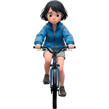 Short haired girl cycling toward viewer not happy getting splashed by rain and muck emoji