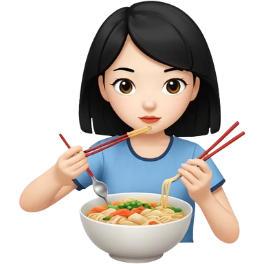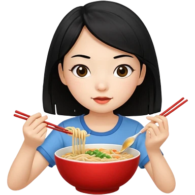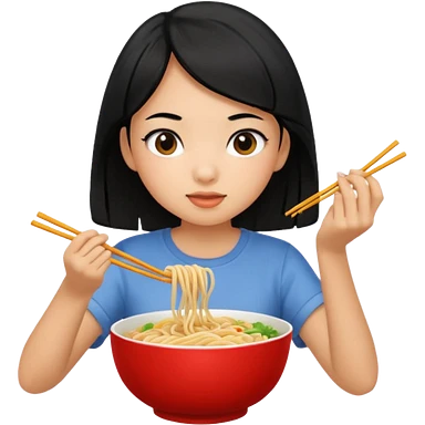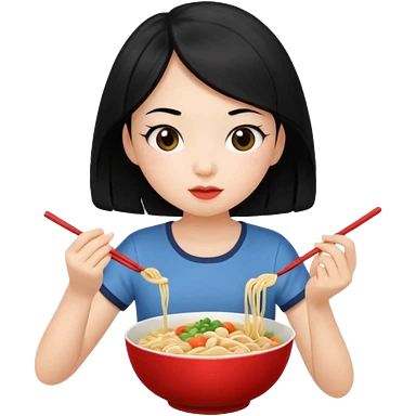 girl with black hair in short sleeves eating noodles emoji