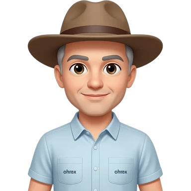 middle-aged, greyish haired man with blue, friendly eyes, dark-rimmed, rectangle glasses, in a green-collared, long-sleeve shirt with an wide-brim Akubra hat. Holding a thumbs up. On right pocket 'THE GREEN CONNECTION' in white. On left shirt pocket, written 'MY TREE DOCTOR' emoji