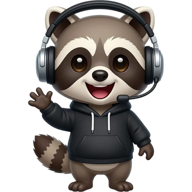 Create a tiny raccoon developer emoji wearing headphones and a black hoodie, excited expression, one paw raised, simple sticker style, centered subject, transparent background. emoji
