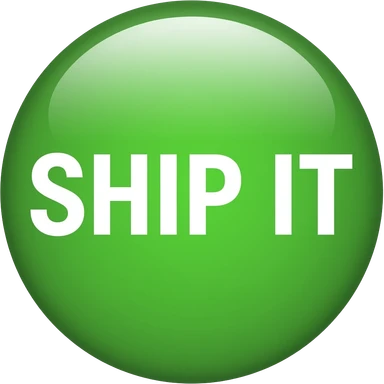 Create a compact custom emoji that says ‘SHIP IT’ in bold white letters on a green rounded badge. Minimal shading, no extra objects, high contrast, readable at tiny size. emoji