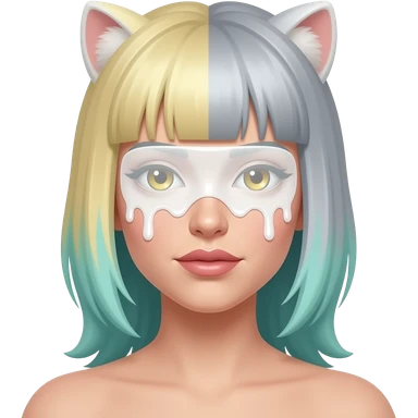 Attractive woman with skunk stripe hair that is platinum, blonde, and ash gray with bluish green, hazel eyes covered in a white sticky gooey substance emoji