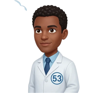 Hacer un emoji con bata, que se alcance a ver una bolígrafo azul en la bata, una polo color negro y un gafete en el pecho con un listón azul que diga forense, la cara que sea androgena un poco femenina, cabello corto peinado, que de su boca salga un globo de hablar que diga 53 emoji