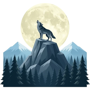 Dağların üstündeki ormanda yüksek kayanın üstünde dolunaya karşı uluyan kurt emoji